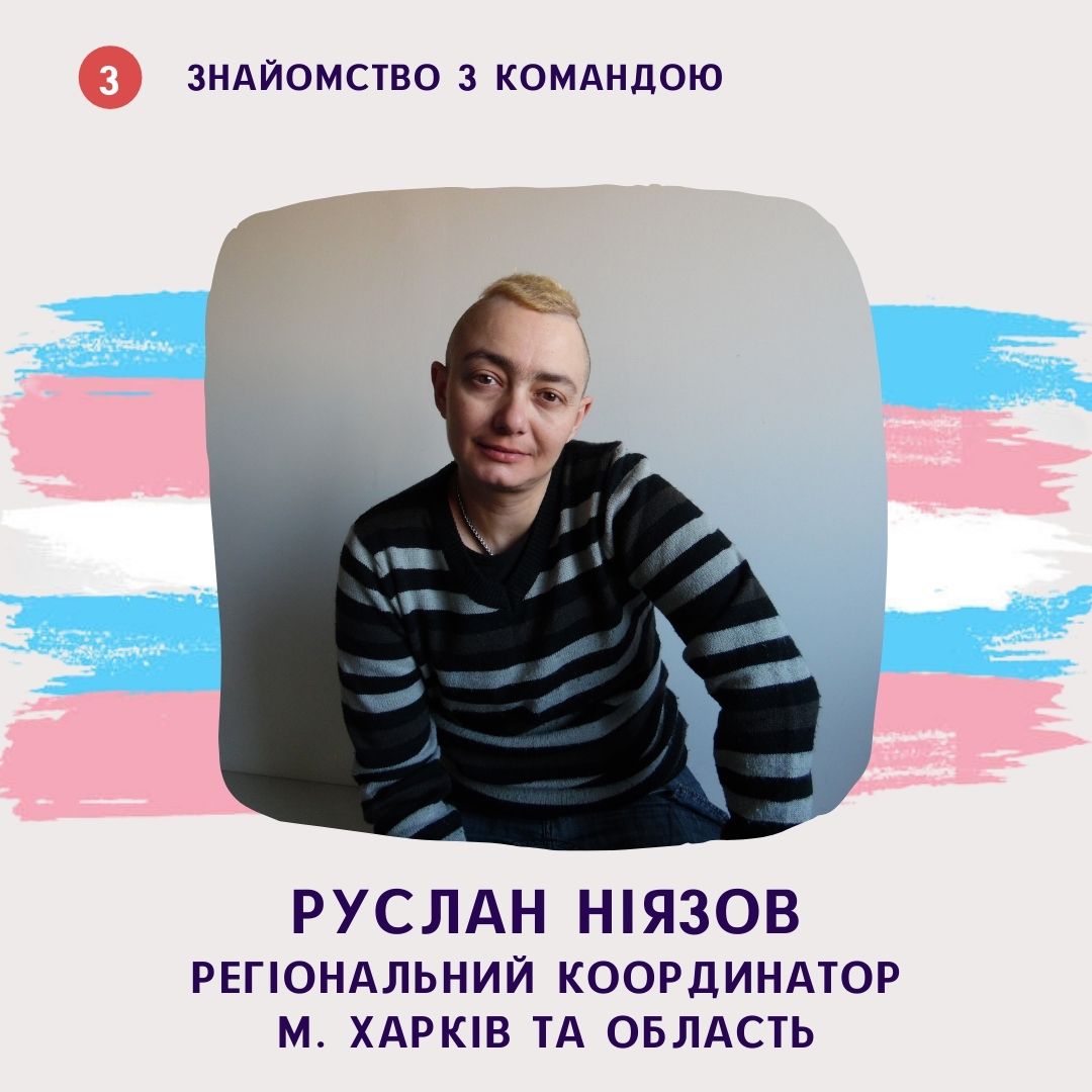 Руслан – транс*хлопець, в активізмі з 2016 року, засновник групи у соціальних мережах для транс*спільноти Харкова. Організатор публічної міської акції до Всесвітнього дня пам’яті транс*людей, а також учасник заходів з транс*тематики в якості живої книги. Руслан вже не перший рік проводить консультації за принципом «рівний – рівному» та організовує тематичні заходи для транс*людей.