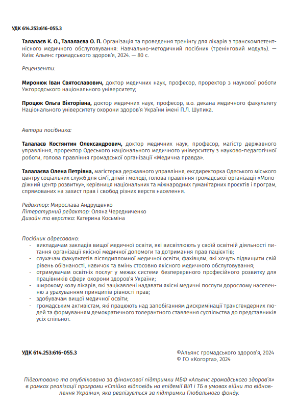“У цьому виданні автори ставили за мету не агітацію за уподобання інших людей, а адвокацію прав кожної людини на повагу і всеосяжне та якісне медичне обслуговування”, — саме цією цитатою можна описати основну мету створення навчально-методичного посібника «Організація та проведення тренінгу для лікарів з транскомпетентнісного медичного обслуговування». Цей посібник може бути цікавим широкому колу читачів; проте аудиторія, яка найперше знайомиться з виданням — це саме студенти та медичні працівники. Тому інформація у виданні була адаптована саме для цієї групи.