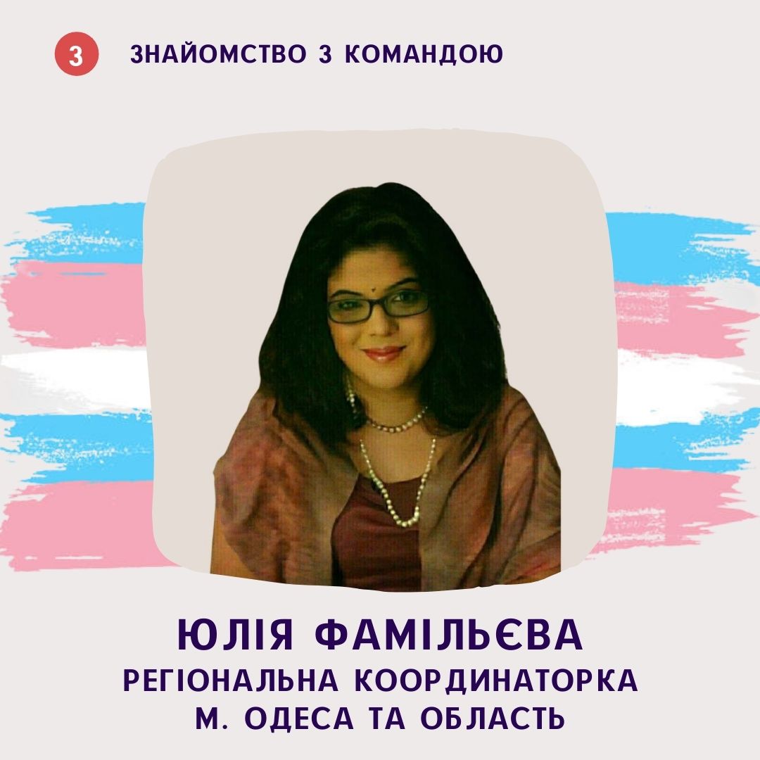Юля має багаторічний досвід психологічної підтримки, надання консультацій за принципом «рівна — рівному» та інформаційного супроводу транс*людей, а ще вона чарівна, емпатійна та амбіційна дівчина, яка має позитивне ставлення до життя та велику довіру серед транс*спільноти Одещини. До кожної людини яка до неї звертається за допомогою, ставиться з особливою відповідальністю.